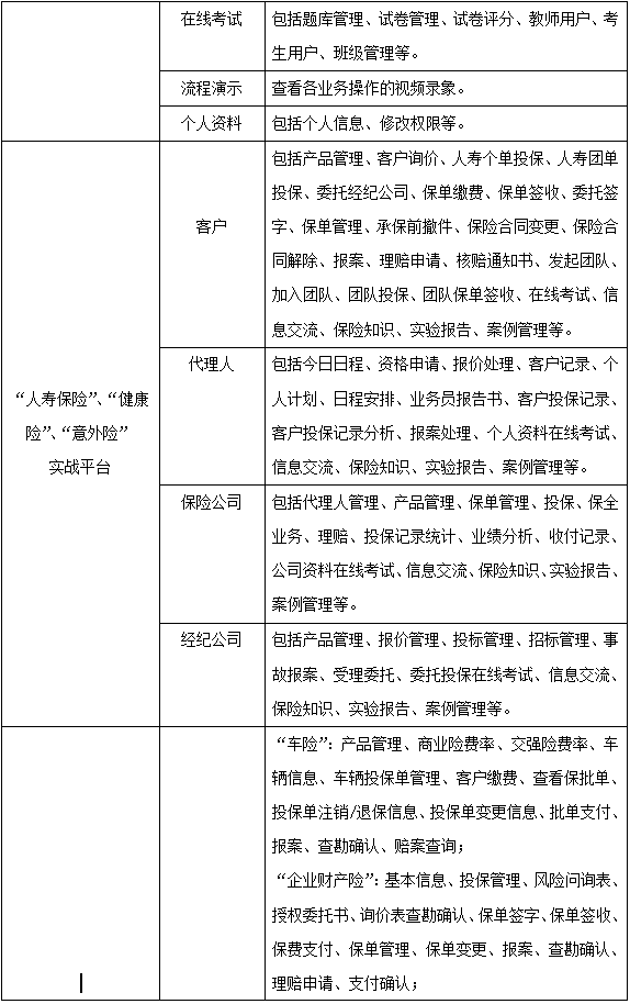 學生通過飾演(yan)保險(xian)(xian)(xian)業(ye)務流程中的(de)客戶(hu)、代理(li)(li)人(ren)、經紀公司、人(ren)壽保險(xian)(xian)(xian)公司、財(cai)產(chan)保險(xian)(xian)(xian)公司五種角色,進入“人(ren)壽保險(xian)(xian)(xian)”和“財(cai)產(chan)保險(xian)(xian)(xian)”實踐平臺(tai),從展(zhan)業(ye)投保環節(jie)開(kai)始,至索(suo)賠理(li)(li)賠為(wei)止,全(quan)面(mian)操(cao)練保險(xian)(xian)(xian)核(he)心業(ye)務中的(de)投保、承(cheng)保、核(he)保、變(bian)更、理(li)(li)賠、核(he)賠等流程,使學生的(de)知識結構提升,彌補實踐業(ye)務操(cao)作的(de)缺乏,實現對人(ren)壽保險(xian)(xian)(xian)、運輸(shu)工(gong)(gong)具(ju)車輛險(xian)(xian)(xian)、企業(ye)財(cai)產(chan)險(xian)(xian)(xian)、家庭財(cai)產(chan)險(xian)(xian)(xian)、海洋運輸(shu)貨物保險(xian)(xian)(xian)、運輸(shu)工(gong)(gong)具(ju)船(chuan)舶險(xian)(xian)(xian)、責任險(xian)(xian)(xian)、工(gong)(gong)程險(xian)(xian)(xian)的(de)熟悉、掌(zhang)握,對保險(xian)(xian)(xian)業(ye)務的(de)主(zhu)要工(gong)(gong)作流程有一個(ge)清(qing)晰的(de)輪廓,為(wei)學以(yi)致用打下堅固的(de)基(ji)礎。