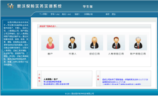 《思沃保(bao)(bao)(bao)(bao)(bao)險(xian)(xian)(xian)(xian)(xian)(xian)實(shi)(shi)(shi)(shi)(shi)務模(mo)擬(ni)實(shi)(shi)(shi)(shi)(shi)訓系統(tong)》用(yong)(yong)(yong)Browser/Server三層體系結(jie)構(gou),將(jiang)現(xian)行(xing)的(de)(de)(de)(de)(de)人(ren)(ren)壽(shou)(shou)保(bao)(bao)(bao)(bao)(bao)險(xian)(xian)(xian)(xian)(xian)(xian)、財(cai)(cai)產(chan)保(bao)(bao)(bao)(bao)(bao)險(xian)(xian)(xian)(xian)(xian)(xian)核(he)心(xin)(xin)業(ye)務流(liu)程(cheng)和(he)專業(ye)知(zhi)識(shi)有(you)(you)機結(jie)合,締造出一(yi)個擬(ni)真的(de)(de)(de)(de)(de)“保(bao)(bao)(bao)(bao)(bao)險(xian)(xian)(xian)(xian)(xian)(xian)實(shi)(shi)(shi)(shi)(shi)務模(mo)擬(ni)實(shi)(shi)(shi)(shi)(shi)驗(yan)(yan)平(ping)(ping)(ping)臺(tai)(tai)(tai)”。實(shi)(shi)(shi)(shi)(shi)驗(yan)(yan)平(ping)(ping)(ping)臺(tai)(tai)(tai)采用(yong)(yong)(yong)經典的(de)(de)(de)(de)(de)角色(se)模(mo)擬(ni)方式(shi),通(tong)過(guo)(guo)學(xue)(xue)(xue)生(sheng)飾演客戶、保(bao)(bao)(bao)(bao)(bao)險(xian)(xian)(xian)(xian)(xian)(xian)代(dai)理(li)(li)(li)(li)人(ren)(ren)、保(bao)(bao)(bao)(bao)(bao)險(xian)(xian)(xian)(xian)(xian)(xian)經紀(ji)公(gong)(gong)(gong)司(si)(si)(si)(si)、人(ren)(ren)壽(shou)(shou)保(bao)(bao)(bao)(bao)(bao)險(xian)(xian)(xian)(xian)(xian)(xian)公(gong)(gong)(gong)司(si)(si)(si)(si)、財(cai)(cai)產(chan)保(bao)(bao)(bao)(bao)(bao)險(xian)(xian)(xian)(xian)(xian)(xian)公(gong)(gong)(gong)司(si)(si)(si)(si)五類(lei)角色(se),分別進(jin)(jin)入(ru)人(ren)(ren)壽(shou)(shou)保(bao)(bao)(bao)(bao)(bao)險(xian)(xian)(xian)(xian)(xian)(xian)實(shi)(shi)(shi)(shi)(shi)驗(yan)(yan)平(ping)(ping)(ping)臺(tai)(tai)(tai)、車(che)輛運輸險(xian)(xian)(xian)(xian)(xian)(xian)實(shi)(shi)(shi)(shi)(shi)驗(yan)(yan)平(ping)(ping)(ping)臺(tai)(tai)(tai)、企業(ye)財(cai)(cai)產(chan)險(xian)(xian)(xian)(xian)(xian)(xian)實(shi)(shi)(shi)(shi)(shi)驗(yan)(yan)平(ping)(ping)(ping)臺(tai)(tai)(tai)、家庭財(cai)(cai)產(chan)險(xian)(xian)(xian)(xian)(xian)(xian)實(shi)(shi)(shi)(shi)(shi)驗(yan)(yan)平(ping)(ping)(ping)臺(tai)(tai)(tai)、工程(cheng)責(ze)(ze)任險(xian)(xian)(xian)(xian)(xian)(xian)實(shi)(shi)(shi)(shi)(shi)驗(yan)(yan)平(ping)(ping)(ping)臺(tai)(tai)(tai)、公(gong)(gong)(gong)眾責(ze)(ze)任險(xian)(xian)(xian)(xian)(xian)(xian)實(shi)(shi)(shi)(shi)(shi)驗(yan)(yan)平(ping)(ping)(ping)臺(tai)(tai)(tai)、運輸工具(ju)船舶險(xian)(xian)(xian)(xian)(xian)(xian)實(shi)(shi)(shi)(shi)(shi)驗(yan)(yan)平(ping)(ping)(ping)臺(tai)(tai)(tai)、海洋運輸貨(huo)物險(xian)(xian)(xian)(xian)(xian)(xian)實(shi)(shi)(shi)(shi)(shi)驗(yan)(yan)平(ping)(ping)(ping)臺(tai)(tai)(tai),操(cao)(cao)練人(ren)(ren)壽(shou)(shou)保(bao)(bao)(bao)(bao)(bao)險(xian)(xian)(xian)(xian)(xian)(xian)、財(cai)(cai)產(chan)保(bao)(bao)(bao)(bao)(bao)險(xian)(xian)(xian)(xian)(xian)(xian)實(shi)(shi)(shi)(shi)(shi)踐業(ye)務。首先由(you)人(ren)(ren)壽(shou)(shou)保(bao)(bao)(bao)(bao)(bao)險(xian)(xian)(xian)(xian)(xian)(xian)公(gong)(gong)(gong)司(si)(si)(si)(si)、財(cai)(cai)產(chan)保(bao)(bao)(bao)(bao)(bao)險(xian)(xian)(xian)(xian)(xian)(xian)公(gong)(gong)(gong)司(si)(si)(si)(si)添加(jia)自己所經營的(de)(de)(de)(de)(de)主險(xian)(xian)(xian)(xian)(xian)(xian)、附加(jia)險(xian)(xian)(xian)(xian)(xian)(xian)產(chan)品(pin),以(yi)及(ji)相關的(de)(de)(de)(de)(de)費率,由(you)投(tou)保(bao)(bao)(bao)(bao)(bao)客戶根據(ju)險(xian)(xian)(xian)(xian)(xian)(xian)種的(de)(de)(de)(de)(de)特點、性(xing)質,委托保(bao)(bao)(bao)(bao)(bao)險(xian)(xian)(xian)(xian)(xian)(xian)代(dai)理(li)(li)(li)(li)人(ren)(ren)或(huo)經紀(ji)公(gong)(gong)(gong)司(si)(si)(si)(si)進(jin)(jin)行(xing)投(tou)保(bao)(bao)(bao)(bao)(bao),或(huo)直接向人(ren)(ren)壽(shou)(shou)保(bao)(bao)(bao)(bao)(bao)險(xian)(xian)(xian)(xian)(xian)(xian)公(gong)(gong)(gong)司(si)(si)(si)(si)、財(cai)(cai)產(chan)保(bao)(bao)(bao)(bao)(bao)險(xian)(xian)(xian)(xian)(xian)(xian)公(gong)(gong)(gong)司(si)(si)(si)(si)投(tou)保(bao)(bao)(bao)(bao)(bao)。保(bao)(bao)(bao)(bao)(bao)險(xian)(xian)(xian)(xian)(xian)(xian)公(gong)(gong)(gong)司(si)(si)(si)(si)接到客戶投(tou)保(bao)(bao)(bao)(bao)(bao)單之(zhi)后(hou),根據(ju)投(tou)保(bao)(bao)(bao)(bao)(bao)險(xian)(xian)(xian)(xian)(xian)(xian)種的(de)(de)(de)(de)(de)不同,進(jin)(jin)行(xing)投(tou)保(bao)(bao)(bao)(bao)(bao)管(guan)理(li)(li)(li)(li)。通(tong)過(guo)(guo)一(yi)系列(lie)、多流(liu)程(cheng)操(cao)(cao)作,使學(xue)(xue)(xue)生(sheng)真正學(xue)(xue)(xue)習(xi)到保(bao)(bao)(bao)(bao)(bao)險(xian)(xian)(xian)(xian)(xian)(xian)實(shi)(shi)(shi)(shi)(shi)務中的(de)(de)(de)(de)(de)保(bao)(bao)(bao)(bao)(bao)險(xian)(xian)(xian)(xian)(xian)(xian)代(dai)理(li)(li)(li)(li)、投(tou)保(bao)(bao)(bao)(bao)(bao)、承保(bao)(bao)(bao)(bao)(bao)、核(he)保(bao)(bao)(bao)(bao)(bao)、變更、理(li)(li)(li)(li)賠、核(he)賠等核(he)心(xin)(xin)流(liu)程(cheng)。軟件既支持(chi)學(xue)(xue)(xue)生(sheng)一(yi)人(ren)(ren)分飾客戶、保(bao)(bao)(bao)(bao)(bao)險(xian)(xian)(xian)(xian)(xian)(xian)代(dai)理(li)(li)(li)(li)人(ren)(ren)、保(bao)(bao)(bao)(bao)(bao)險(xian)(xian)(xian)(xian)(xian)(xian)經紀(ji)公(gong)(gong)(gong)司(si)(si)(si)(si)、人(ren)(ren)壽(shou)(shou)保(bao)(bao)(bao)(bao)(bao)險(xian)(xian)(xian)(xian)(xian)(xian)公(gong)(gong)(gong)司(si)(si)(si)(si)、財(cai)(cai)產(chan)保(bao)(bao)(bao)(bao)(bao)險(xian)(xian)(xian)(xian)(xian)(xian)公(gong)(gong)(gong)司(si)(si)(si)(si)五類(lei)角色(se)來完成(cheng)保(bao)(bao)(bao)(bao)(bao)險(xian)(xian)(xian)(xian)(xian)(xian)實(shi)(shi)(shi)(shi)(shi)驗(yan)(yan),也(ye)支持(chi)由(you)同一(yi)班級中的(de)(de)(de