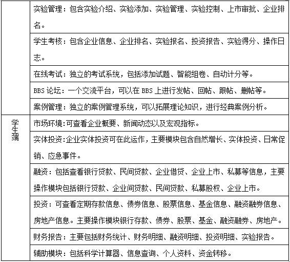 投(tou)(tou)融(rong)(rong)資(zi)決策(ce)實(shi)驗是由學生扮演各種企(qi)(qi)業,教師(shi)給定(ding)企(qi)(qi)業的初始資(zi)金,分(fen)為固定(ding)資(zi)產和流動(dong)資(zi)金兩(liang)部分(fen),學生可(ke)以合理分(fen)配流動(dong)資(zi)金,利用銀(yin)行存款、銀(yin)行貸(dai)(dai)款、債券(quan)、股票、基金、融(rong)(rong)資(zi)融(rong)(rong)券(quan)、房地產、企(qi)(qi)業間貸(dai)(dai)款、民(min)間貸(dai)(dai)款、私募股權、企(qi)(qi)業上(shang)市(shi)等投(tou)(tou)融(rong)(rong)資(zi)手(shou)段,積(ji)累(lei)實(shi)體(ti)投(tou)(tou)資(zi)資(zi)金。