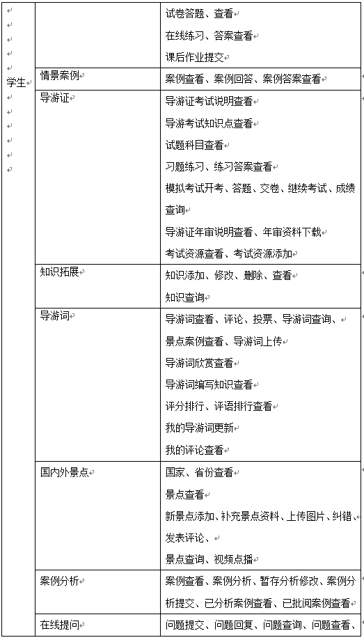 學(xue)生的(de)主要(yao)功(gong)能是導(dao)(dao)游(you)教學(xue)知識(shi)的(de)學(xue)習(xi)、完成情景推理中包含的(de)案(an)例及題目、導(dao)(dao)游(you)證(zheng)考試(shi)學(xue)習(xi)及模(mo)擬考試(shi)、導(dao)(dao)游(you)拓展知識(shi)學(xue)習(xi),同時(shi)可添加新的(de)知識(shi)供其他同學(xue)學(xue)習(xi)、導(dao)(dao)游(you)詞學(xue)習(xi)并編寫導(dao)(dao)游(you)詞、國內外景點學(xue)習(xi)、案(an)例分(fen)析和(he)在線提問。